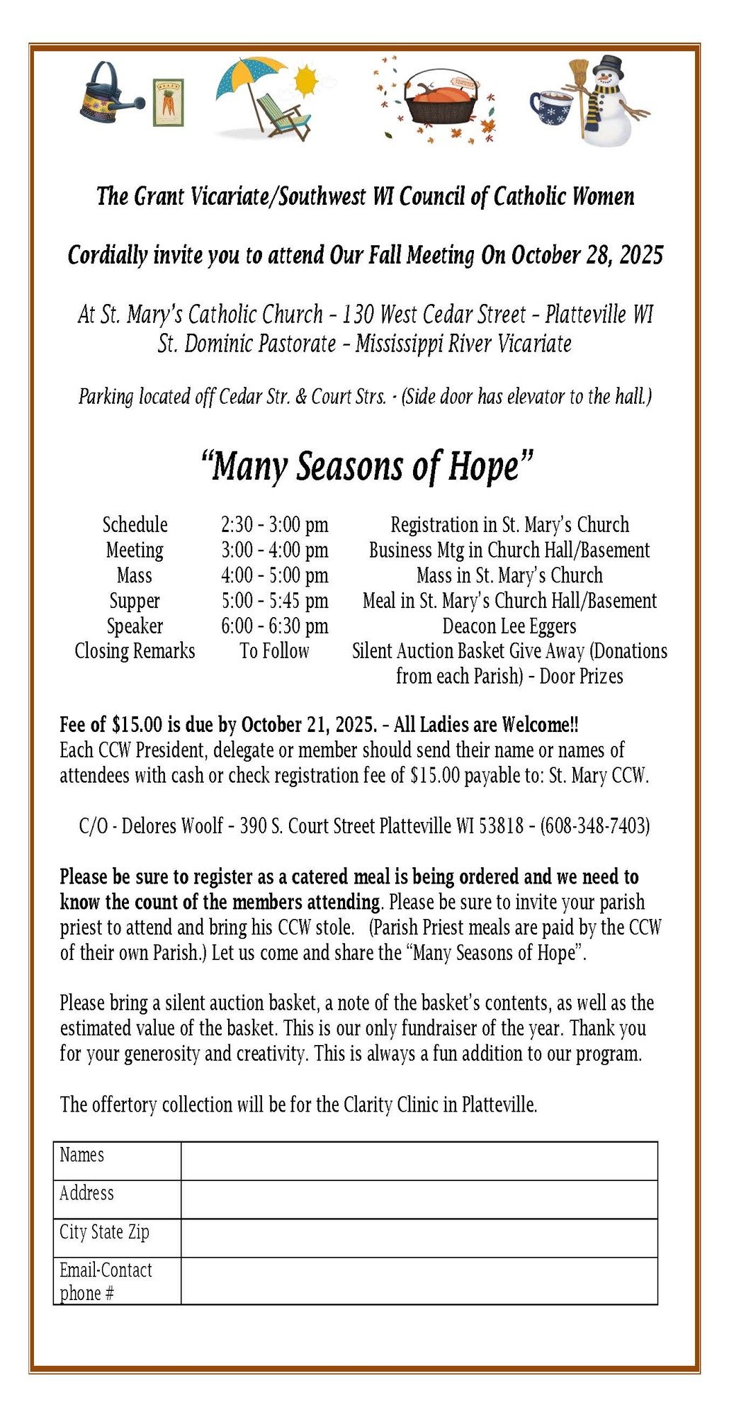 The St. Mary’s CCW in Platteville will be hosting the Fall Grant Council of Catholic Women Meeting on Tuesday, October 28, 2025. Registration will begin at 2:30 PM, followed by a short meeting at 3:00 PM. Mass will be celebrated at 4:00 PM. Supper will be served at 5:00 PM. Please register to make sure you are included in the meal count for a catered supper. The theme for the meeting is “Many Seasons of Hope”. Registrations are due by October 21. All ladies are welcome. Deacon Lee Eggers of Platteville will be our speaker.The cost for the event is $15.00 a person. Please send your registrations to Delores Woolf, 390 S. Court St., Platteville, WI 53818. If you have any questions, please contact Delores (608-348-7403) or Kathy Loy at 608-822-6412. We hope to see you there.